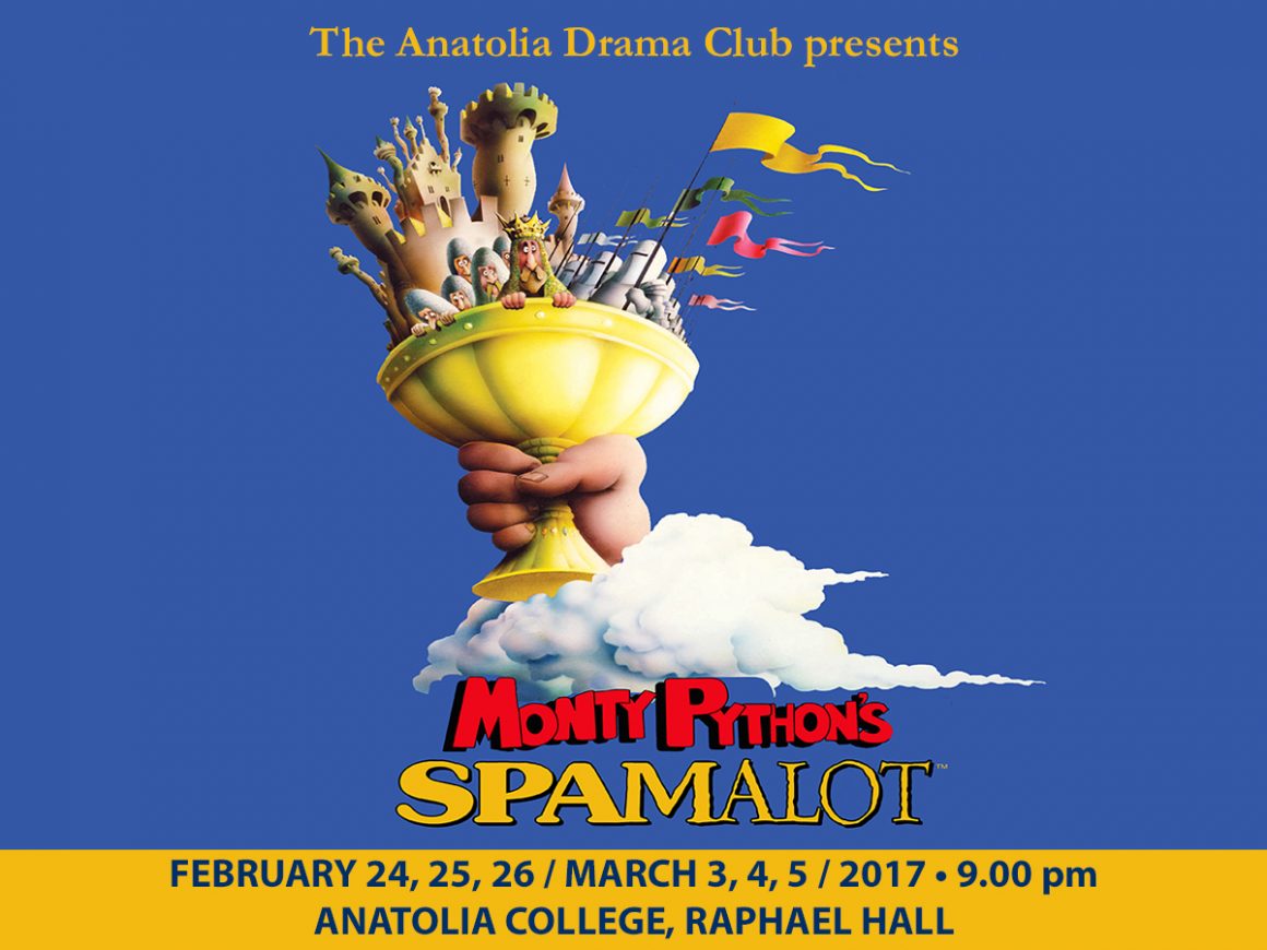 Το Drama Club, ο αγγλόφωνος θεατρικός όμιλος του Αμερικάνικου Κολλεγίου Ανατόλια, ανεβάζει φέτος το μιούζικαλ “Spamalot” στις 24, 25, 26 Φεβρουαρίου και 3, 4, 5 Μαρτίου, στις 9:00 μ.μ., στο θέατρο Raphael Hall του Κολλεγίου Ανατόλια. Το μιούζικαλ βασίζεται στην πασίγνωστη κωμωδία των Μόντυ Πάιθονς “Monty Python and the Holy Grail” και τα τραγούδια είναι των Eric Idle και John DuPrez.